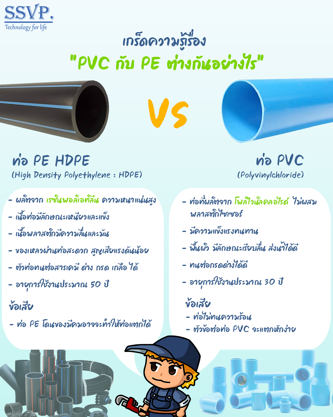 เมื่อเปรียบเทียบระหว่างท่อ PE (HDPE) และท่อ PVC อาจจะมีข้อดี ข้อเสีย แตกต่างกันไปขึ้นอยู่ทีวัตถุประสงค์การใช้งาน และงบประมาณที่เราตั้งไว้ ในการจะเลือกท่อเพื่อที่จะนำไป ติดตั้งภายในบ้านของเราก็ต้องเลือกท่อน้ำ ที่มีคุณภาพและง่ายต่อการดูแลรักา เพราะว่าท่อ แต่ละประเภทก็มีอีกหลายเกรด และที่สำคัญก็อยู่ที่ช่างผู้ติดตั้งจะชำนาญแบบไหนและหากติดตั้งโดยไม่ชำนาญ อาจเกิดปัญหาระยะยาวต่อไป